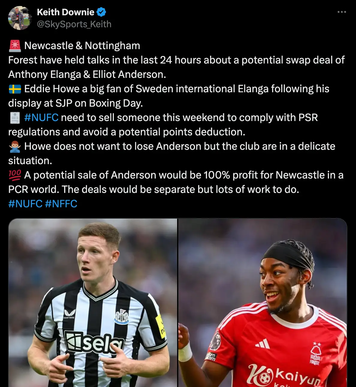 The swap deal between Newcastle and Forest would be completed as separate moves for PSR purposes, but would see a player from each side moving in the opposite direction.