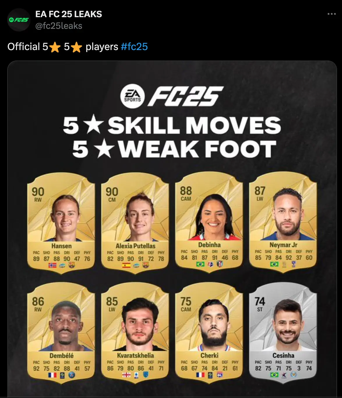 The full list of EA FC 25 five-star skillers has been leaked - and there are no Premier League players on the list.
