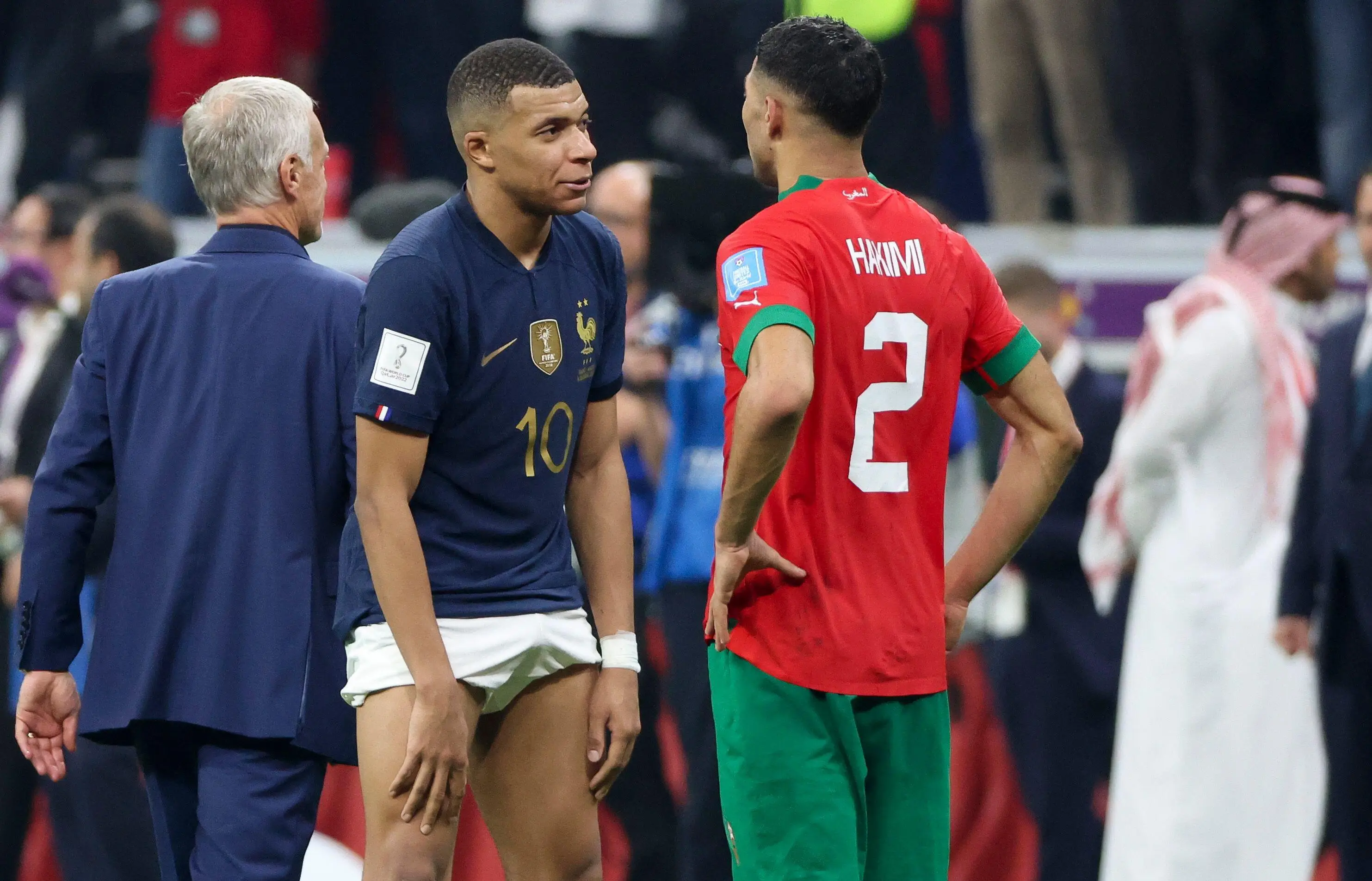 In the wake of Les Bleus' 2-0 victory over the tournament's surprise packages, Mbappe was quick to run over to his PSG teammate Hakimi and console him.