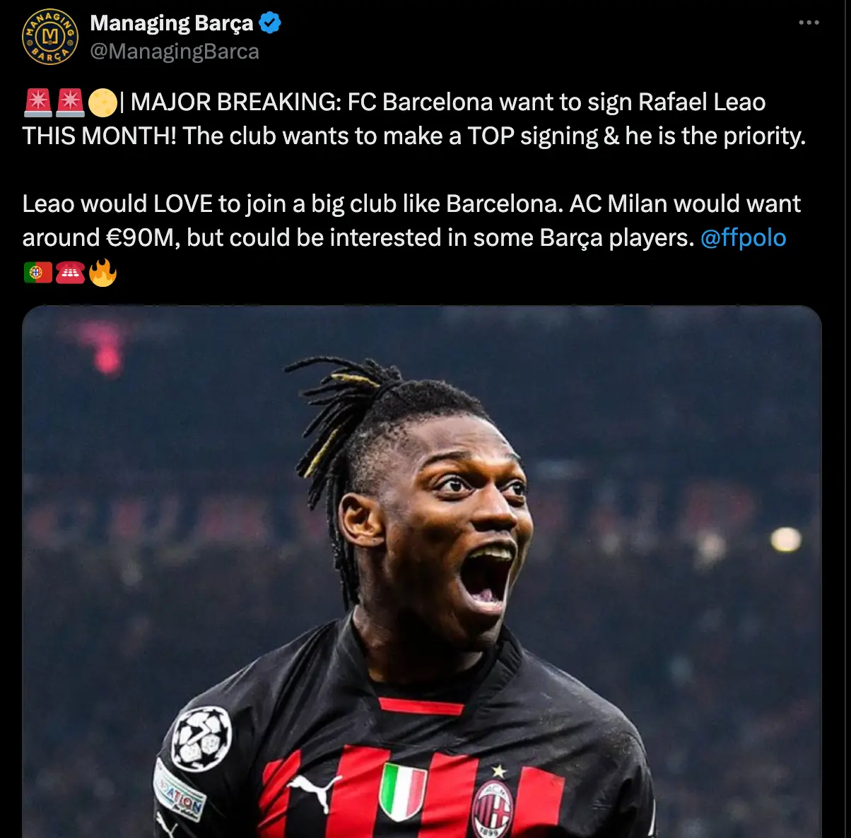 It is said that Leao would 'love' to make the move to a club such as Barca, with Milan demanding around €90 million to sell him.