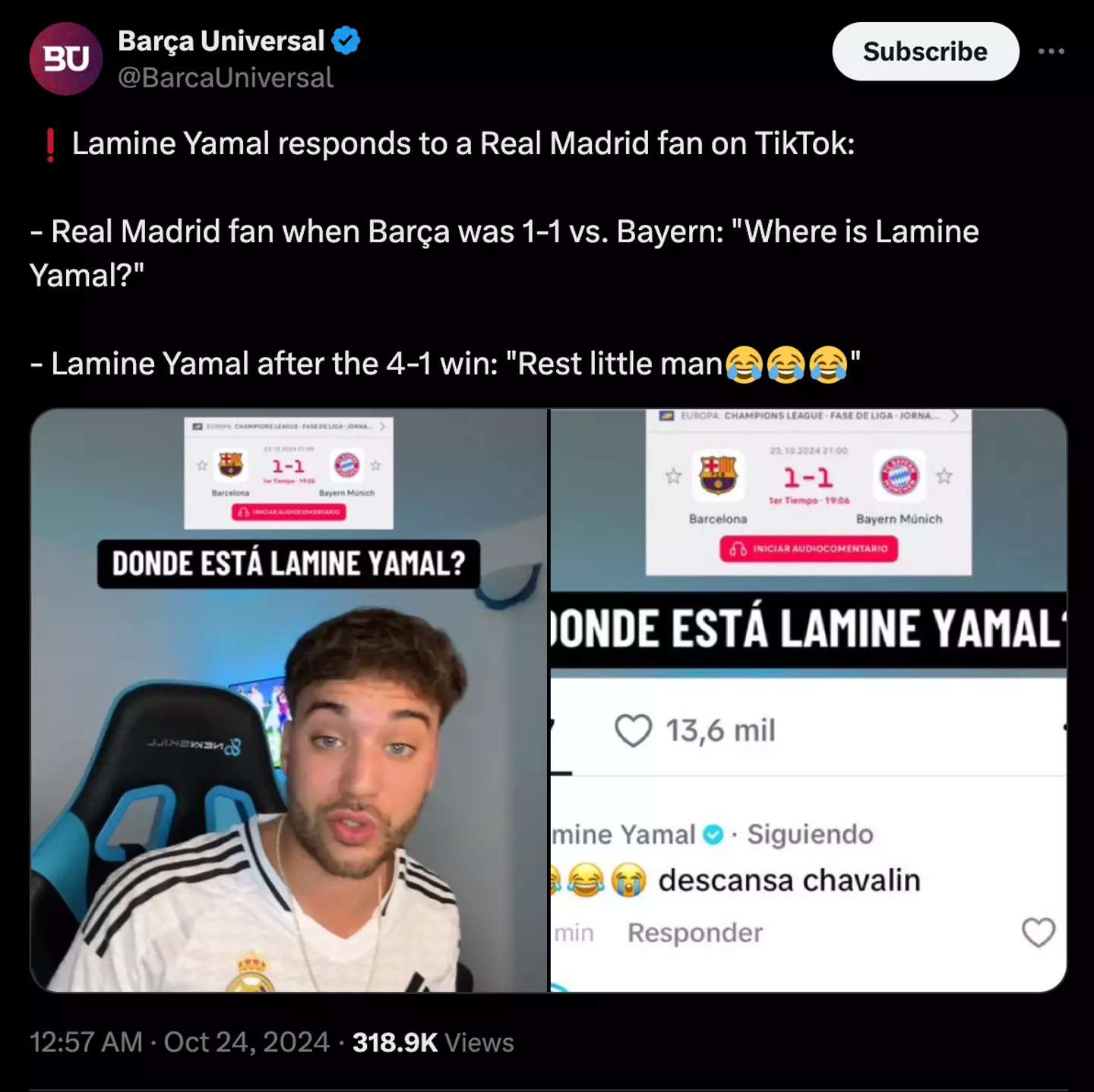 Lamine Yamal destroyed a Real Madrid fan with a three-word message after Barcelona thrashed Bayern Munich 4-1 in the Champions League.