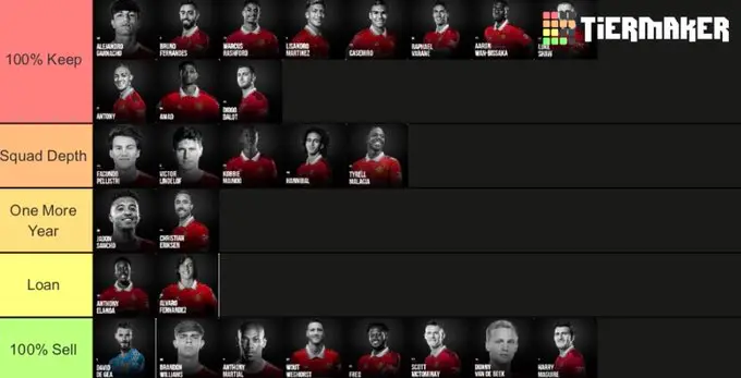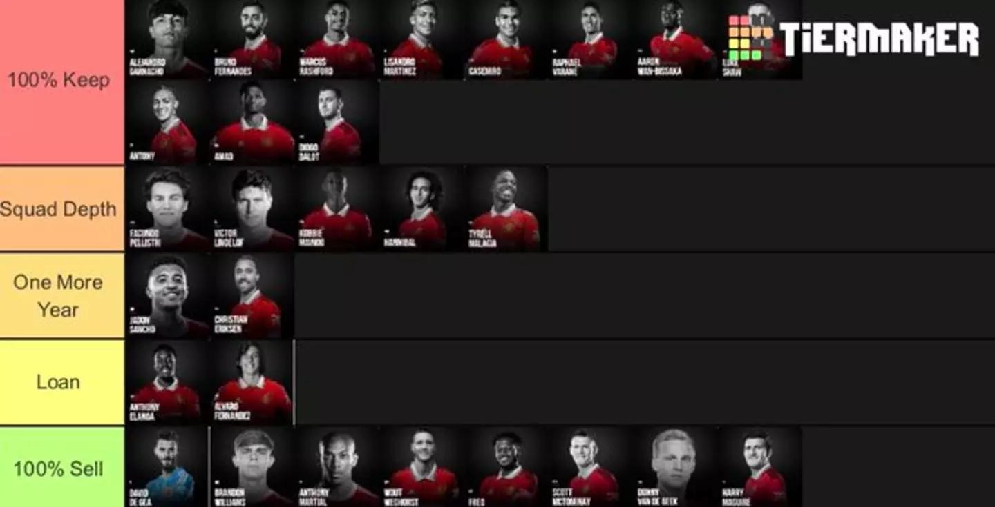 The players on the '100% keep' list included Alejandro Garnacho, Bruno Fernandes, Marcus Rashford, Lisandro Martinez, Casemiro, Raphael Varane, Aaron Wan-Bissaka, Luke Shaw, Antony, Amad Diallo and Diogo Dalot.