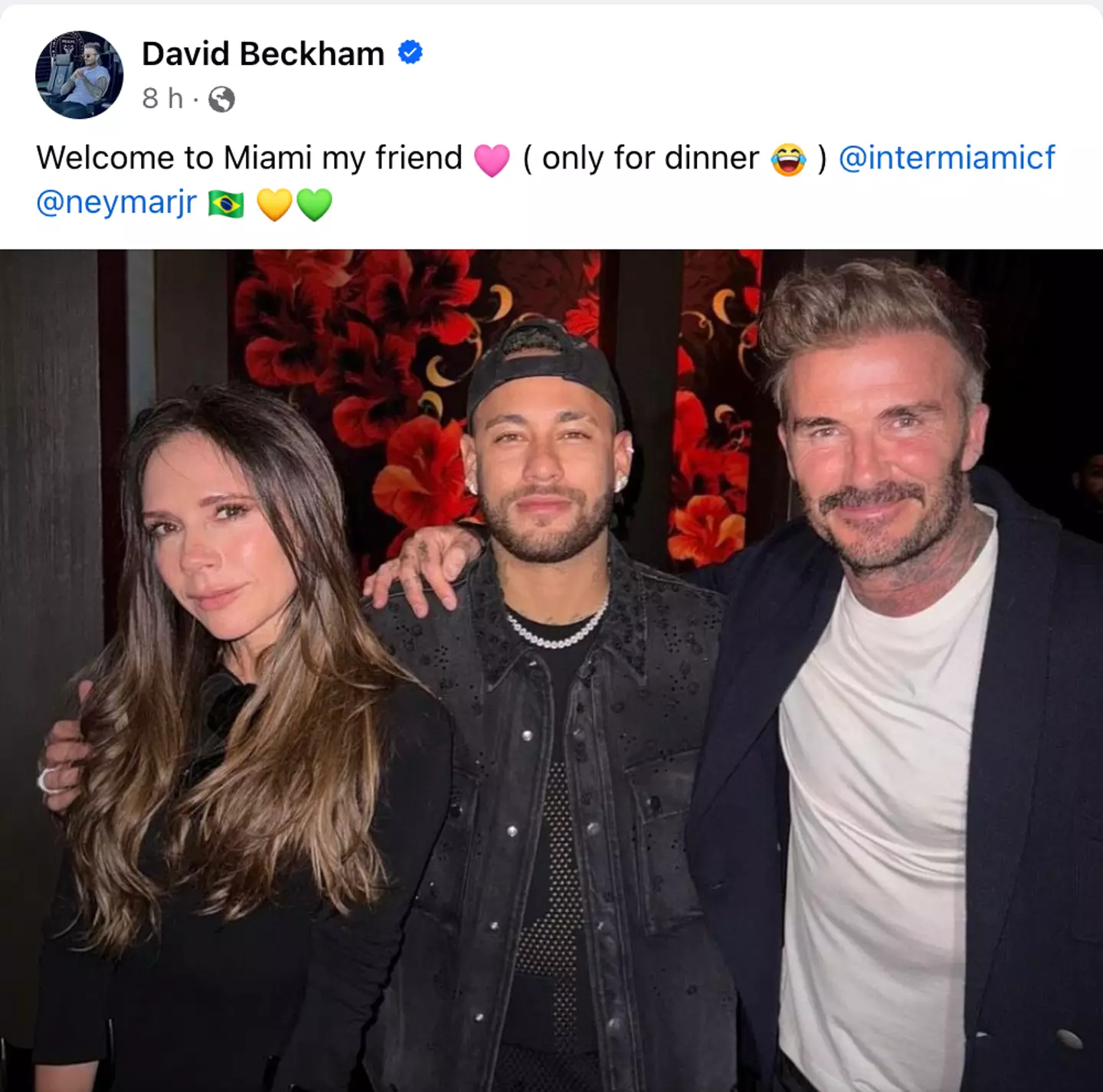 On his official Facebook page, meanwhile, Inter Miami owner Beckham posted a photo of himself, wife Victoria and Neymar enjoying dinner in Miami.