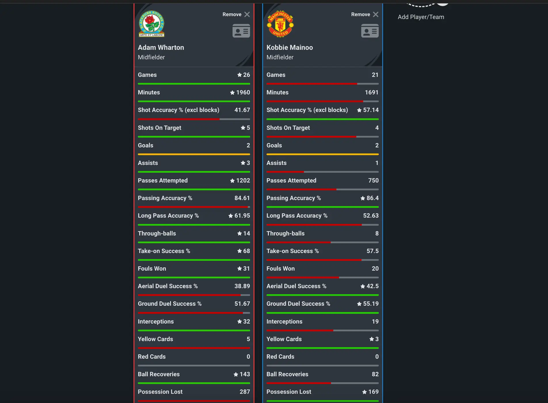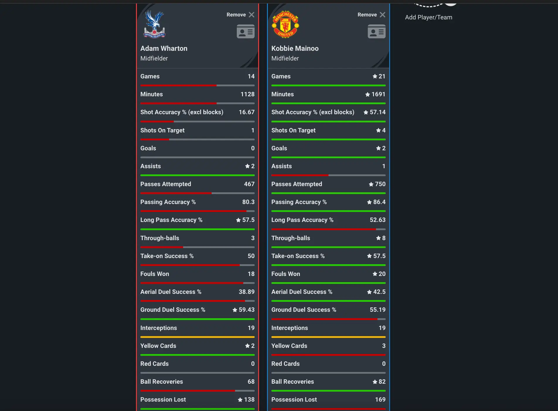 In terms of the passing department, Mainoo leads comfortably in terms of passing accuracy and through balls, although Wharton is more accurate with his long passes.