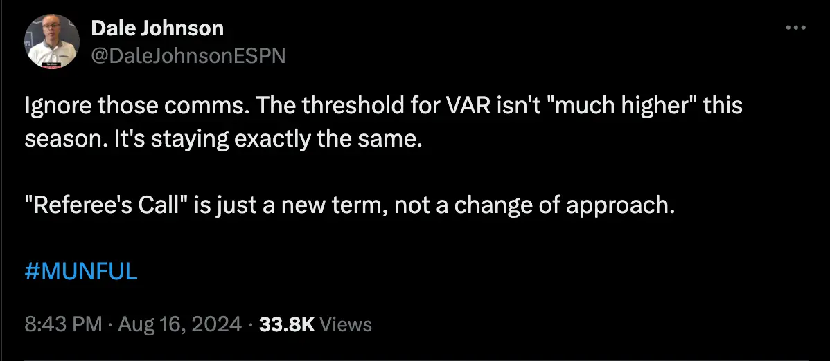 But VAR expert Dale Johnson took issue with the comments, writing on Twitter: "Ignore those comms. The threshold for VAR isn't 'much higher' this season. It's staying exactly the same.