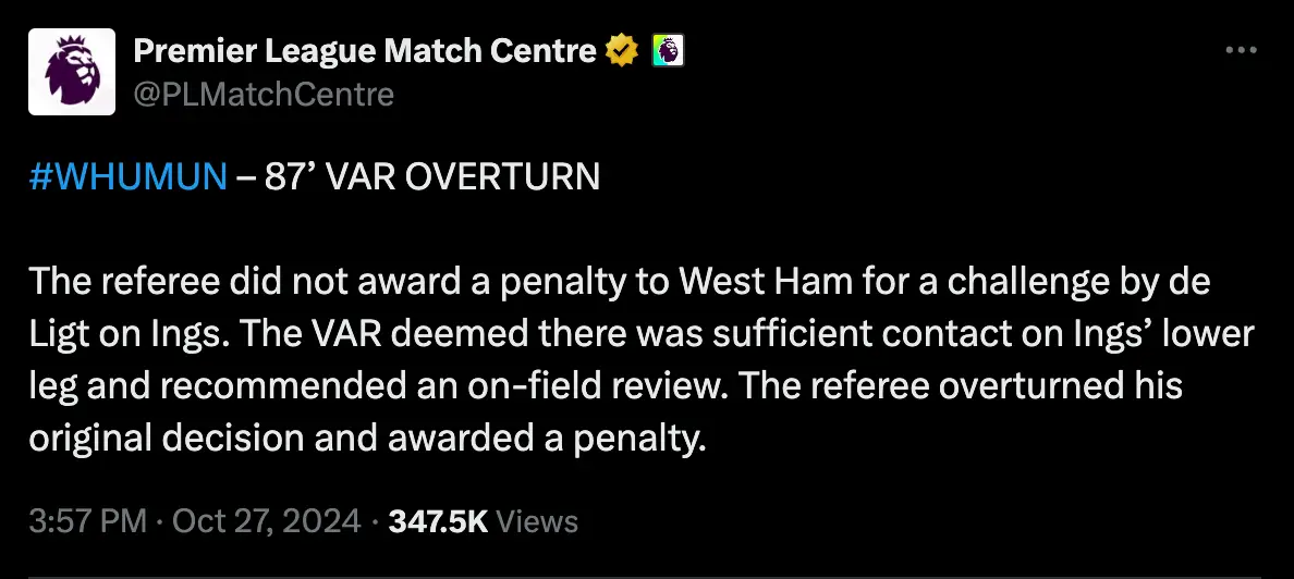 The account posted: "The referee did not award a penalty to West Ham for a challenge by De Ligt on Ings.