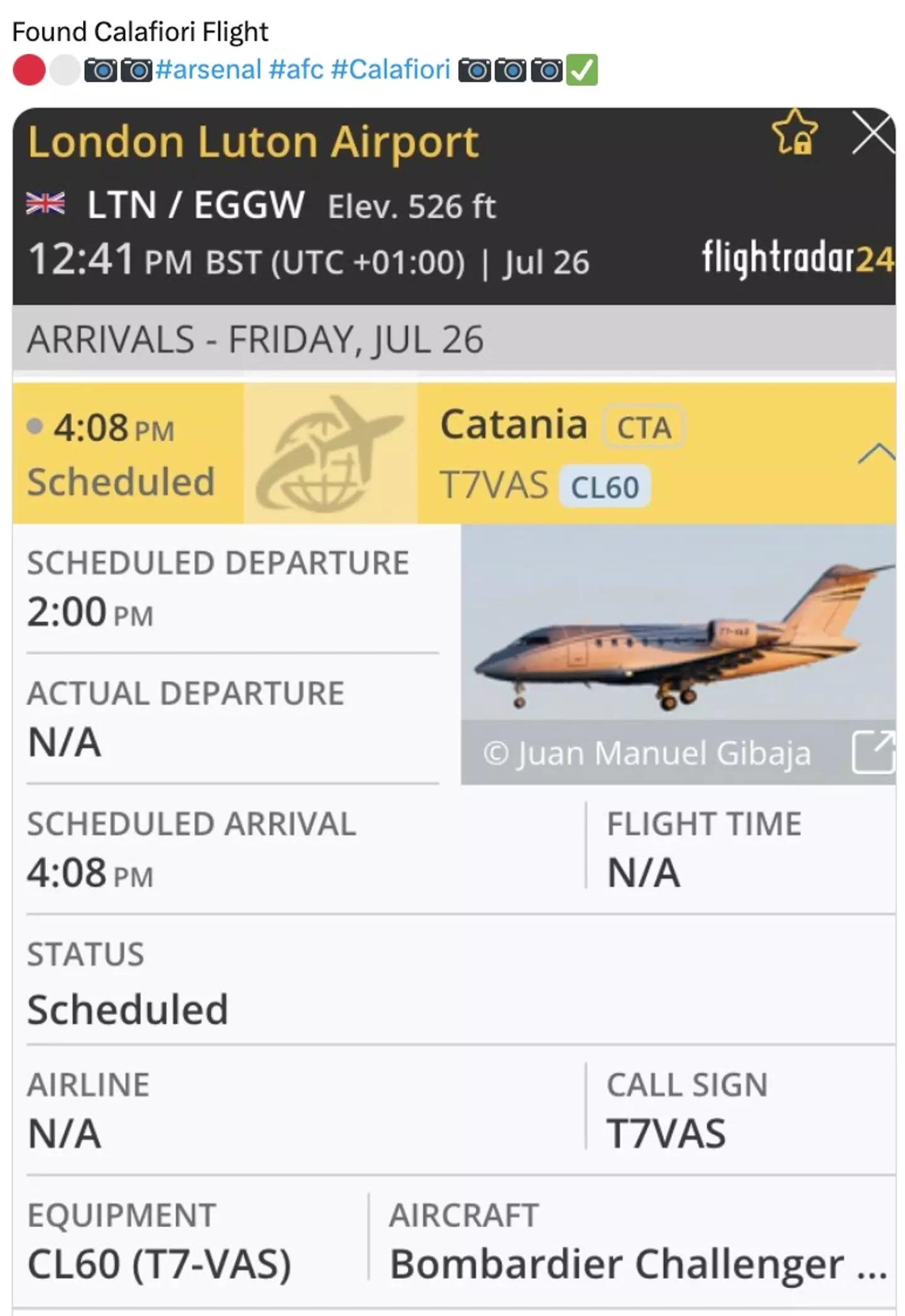 "Found Calafiori's flight," the commented alongside an image of the flight details.