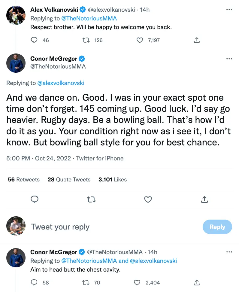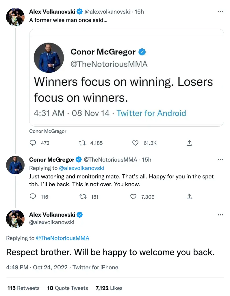 To which Volkanovski responded: "Respect brother. Will be happy to welcome you back."