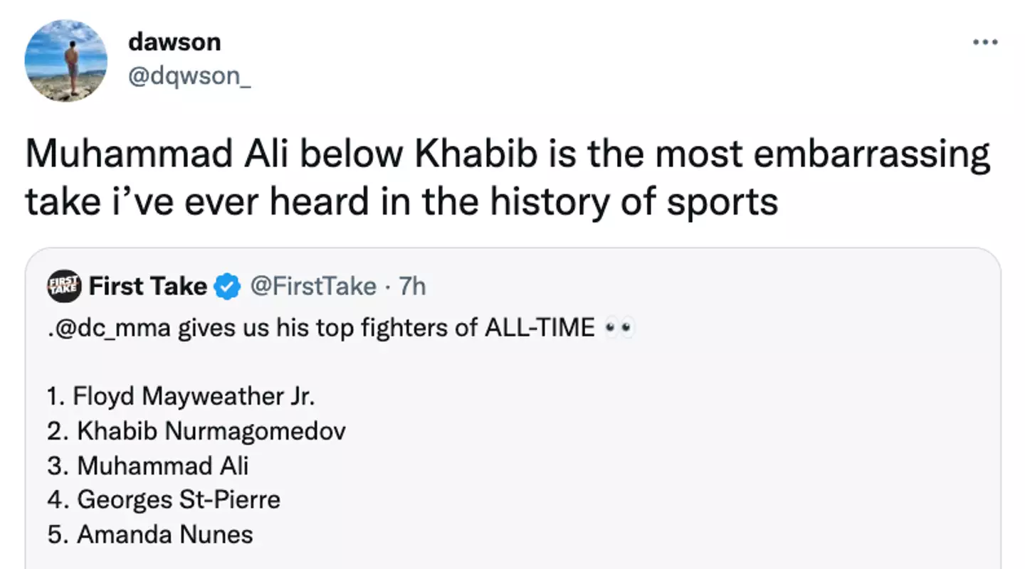 But it was @dqwson_ who had perhaps the most damning assessment, saying: "Muhammad Ali below Khabib is the most embarrassing take i’ve ever heard in the history of sports."