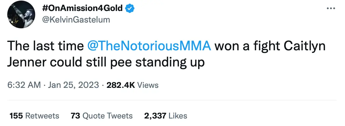 UFC middleweight Kelvin Gastelum was attempting to take aim at Conor McGregor's recent record inside the octagon, thinking he was funny by comparing the Irishman's last victory to the amount of time Olympic gold medallist Caitlyn Jenner has spent as a woman since transitioning.