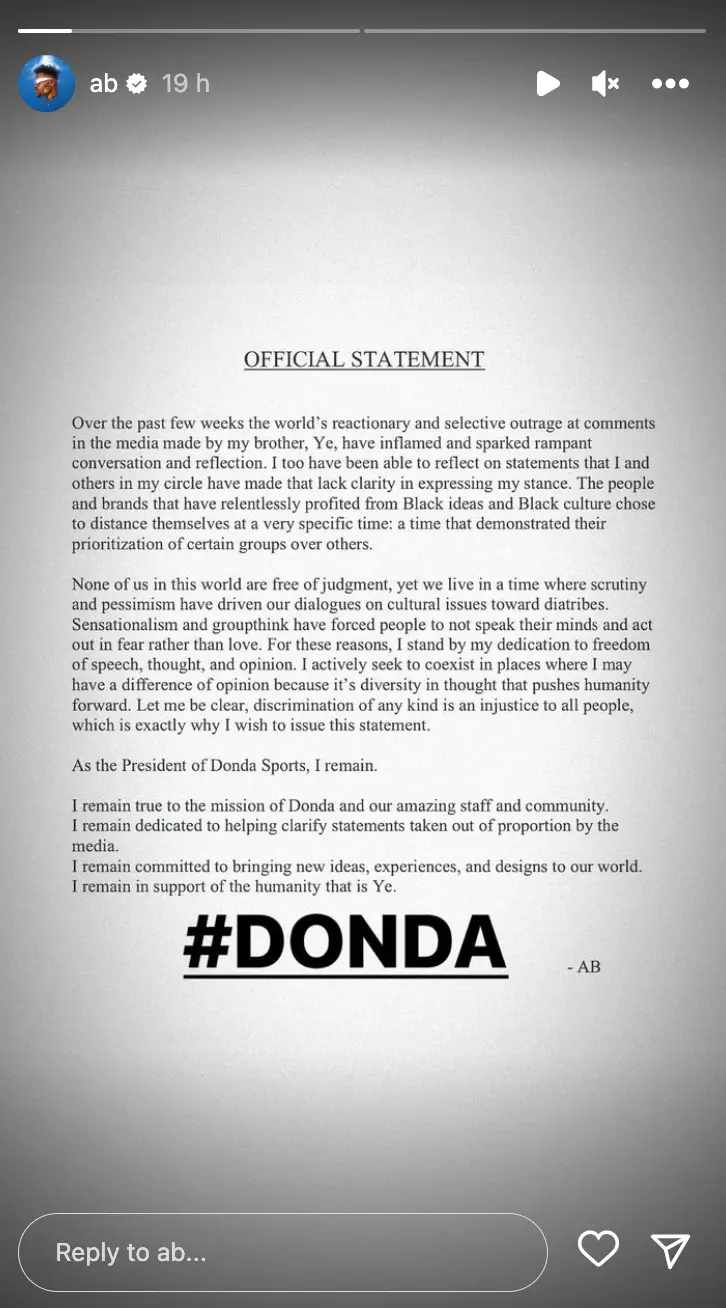 AB, who is the president of Kanye's Donda Sports, said: "The world's reactionary and selective outrage at comments in the media made by my brother, Ye, have inflamed and sparked rampant conversation and reflection."