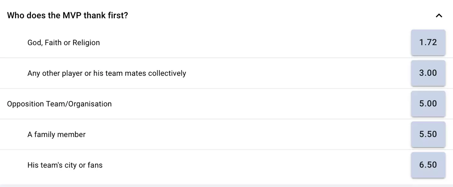 The bookies based Down Under are offering odds on 'Who the MVP will thanks first'.