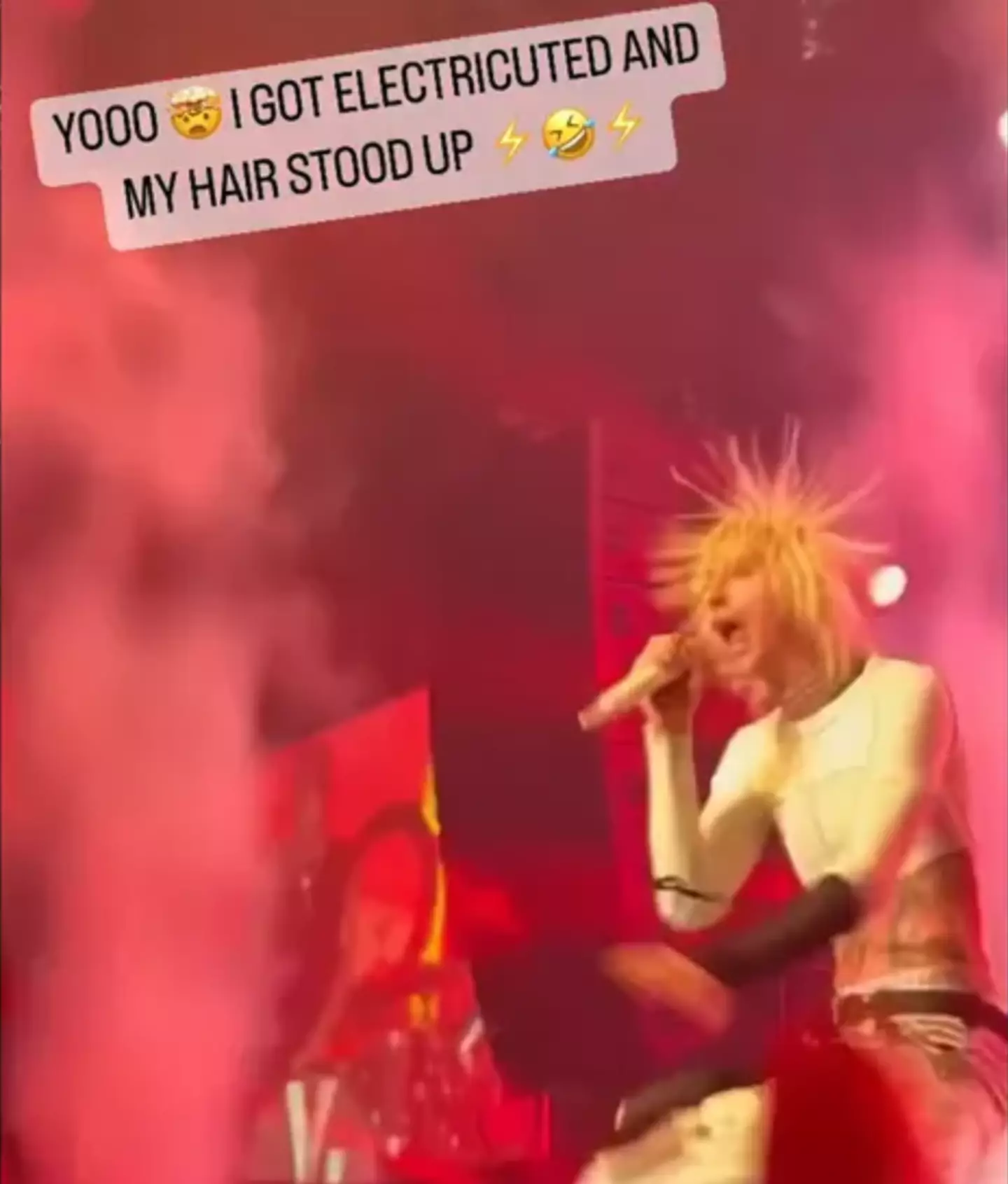 While performing one the songs, smoke blasts and air cannons suddenly appear on-stage and MGK's hair randomly shoots up, giving the look of someone that's been 'electrocuted'.