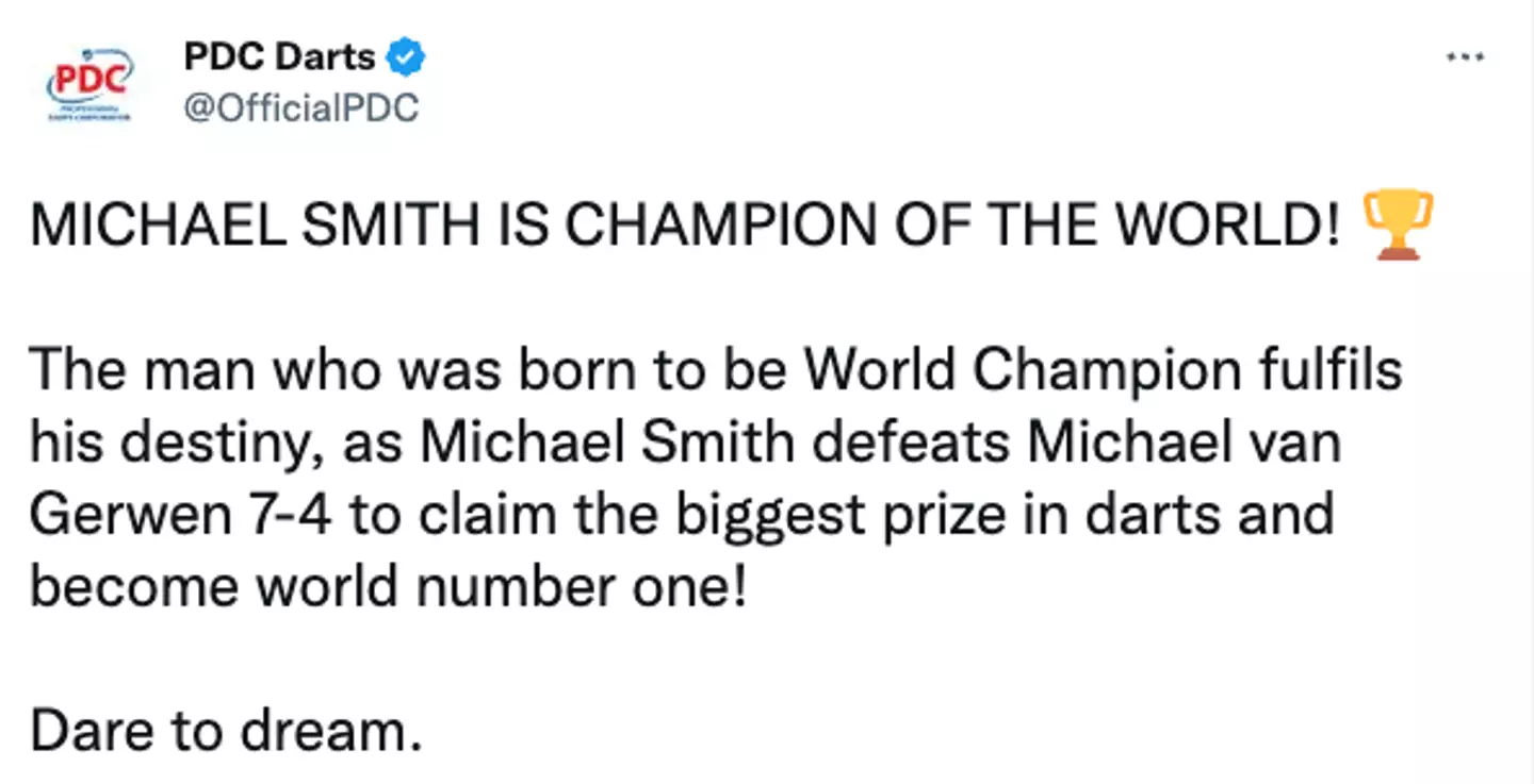 According to The Guardian, van Gerwen 'missed the bull for a 132 and Smith hit D7 with last dart in hand' to take the win with a score of 7-4.