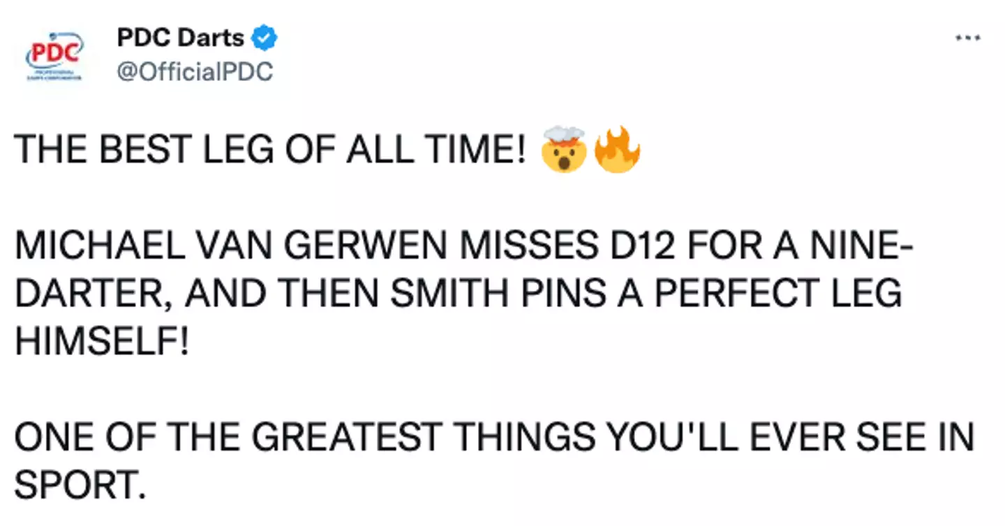 Michael Smith and Michael van Gerwen have left people absolutely gobsmacked after playing arguably the 'best leg of darts of all time'.