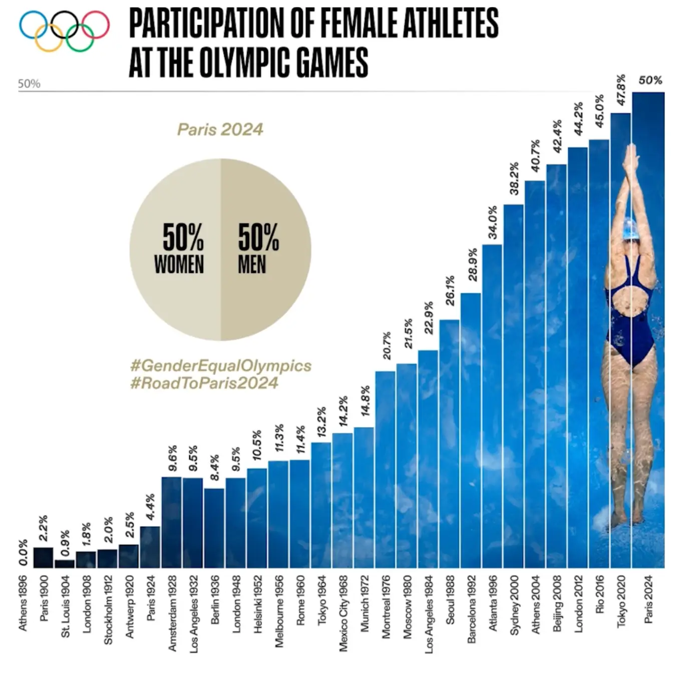 The participation of women, as a percentage of all competitors, has risen in each staging of the Olympics since London 1948, when only 8.5 per cent of the competitors were female.