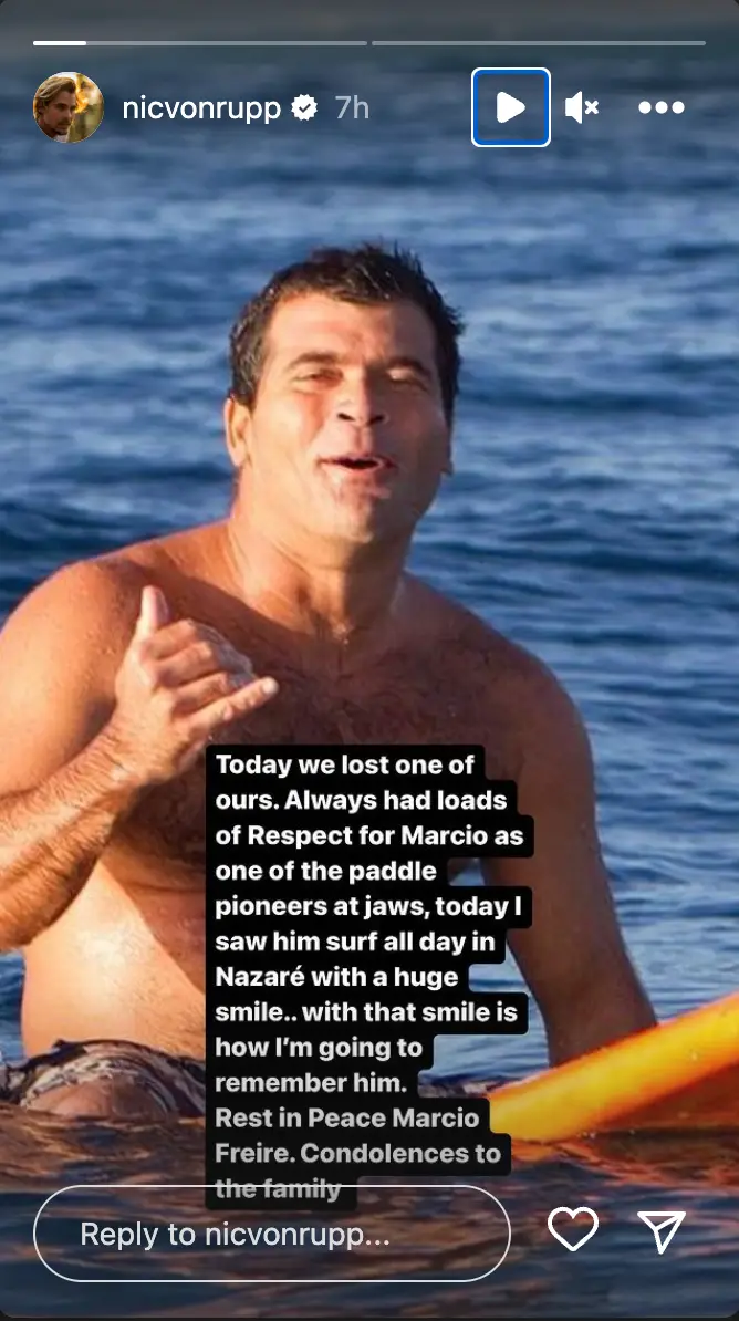 Fellow big wave surfer Nic Von Rupp wrote via an Instagram story: “Today we lost one of ours. Always had loads of respect for Marcio as one of the paddle pioneers at Jaws, today I saw him surf in Nazaré with a huge smile..with that smile is how I’m going to remember him.