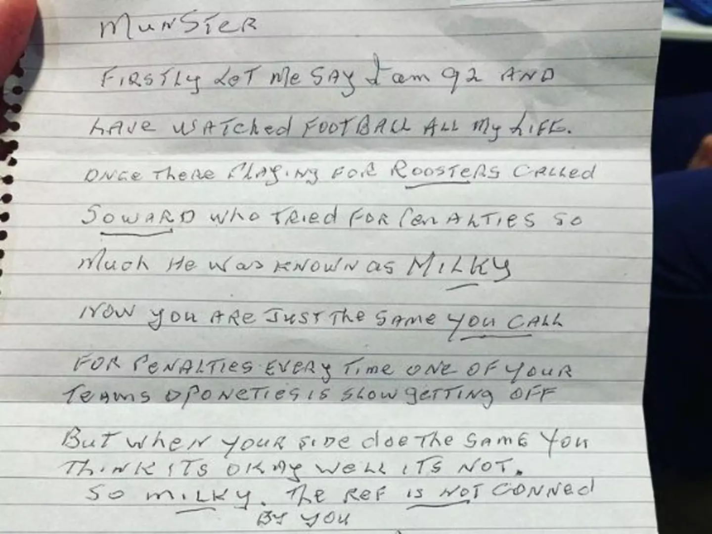 The fan, by the name of George McCracken, let his feelings be known to the NRL player in a one-page letter where he accused Munster of milking unfair penalties, therefore giving him the new nickname ‘Milky’.