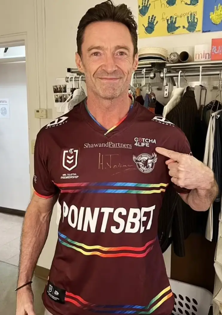 Hugh Jackman has thrown his support behind the LGBTQIA+ community by wearing Manly's pride jersey.