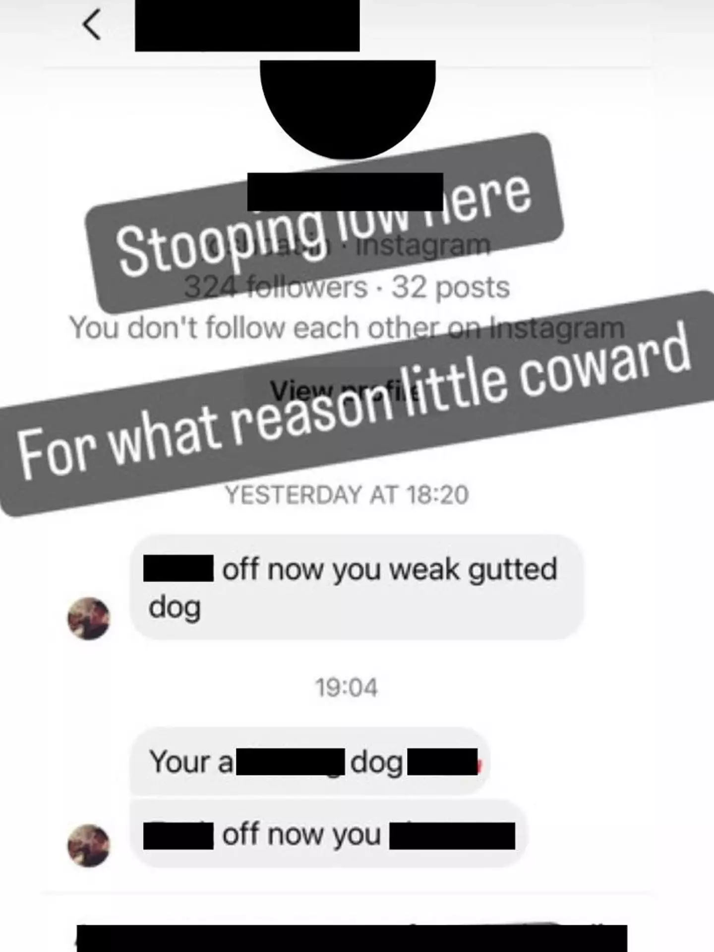 He shared a screenshot of an Instagram DM he had received, writing: “Stooping low here. For what reason little coward.”