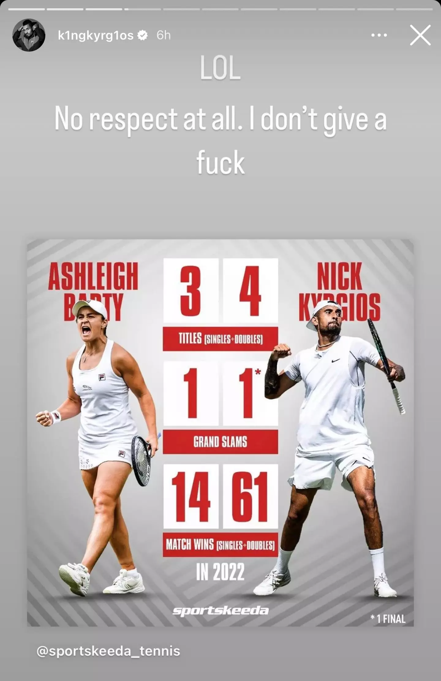 The Wimbledon finalist took to Instagram to air his grievances, sharing a graphic that compared Kyrgios’ 61 wins in 2022 and Barty’s 14 wins.