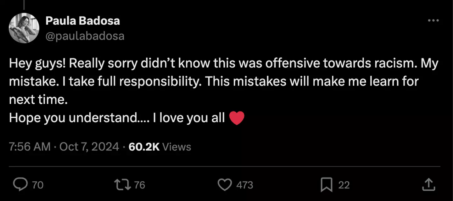 She later posted to Twitter: "Hey guys! Really sorry didn't know this was offensive towards racism.