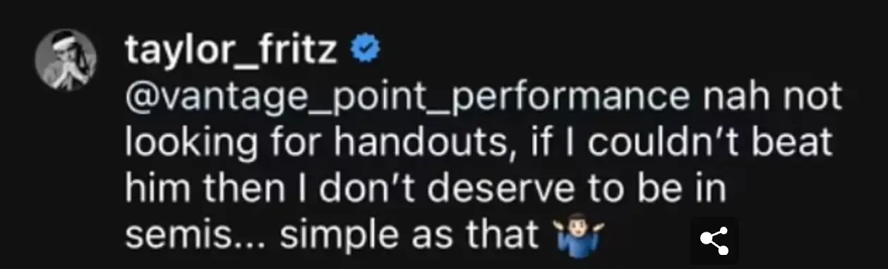Fritz responded: "Nah not looking for handouts, if I couldn't beat him [Nadal] then I don't deserve to be in the semis...simple as that."