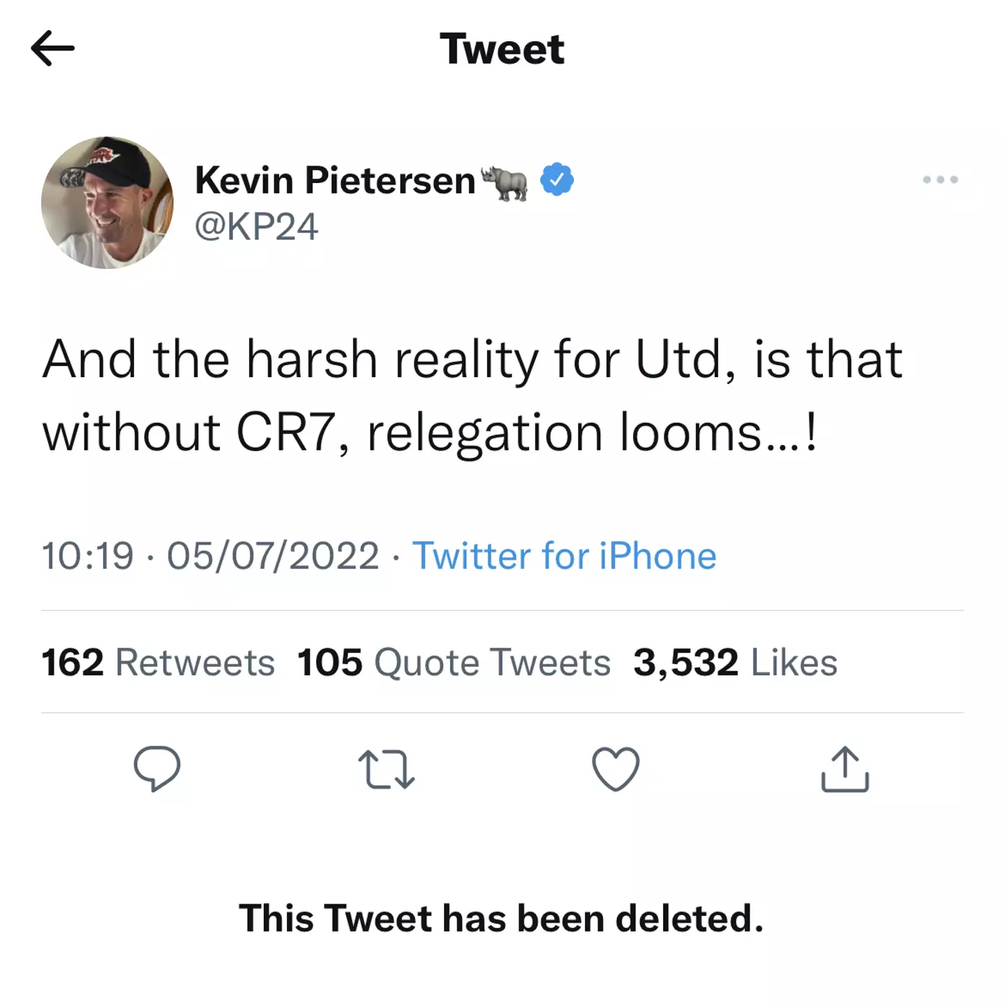 In a recent tweet posted yesterday that has since been deleted, Kevin Pietersen is pessimistic about Manchester United's future without Cristiano Ronaldo with the tweet saying: